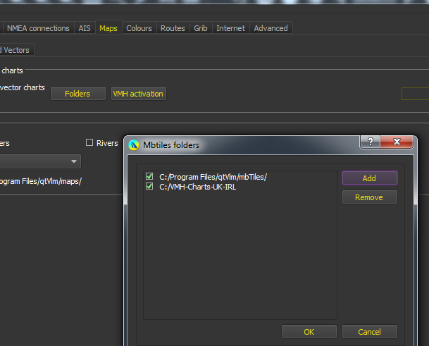 Step 3 Find the qtVlm program installation folder and put the * .vmh file and the matching * .hdx file in the MBtiles folder.( On Windows Program Files >>> qtvlm>>> mbtiles). The crux of the matter is to get the VMH charts.. the 2 items..into the mbtiles folder of the qtVlm program. NOTE: You can make copies of the charts and save carefully elsewhere. NOTE 2: You can put the VMH charts in a seprarate folder elsewhere and point qtVlm at this folder .. as shown below.